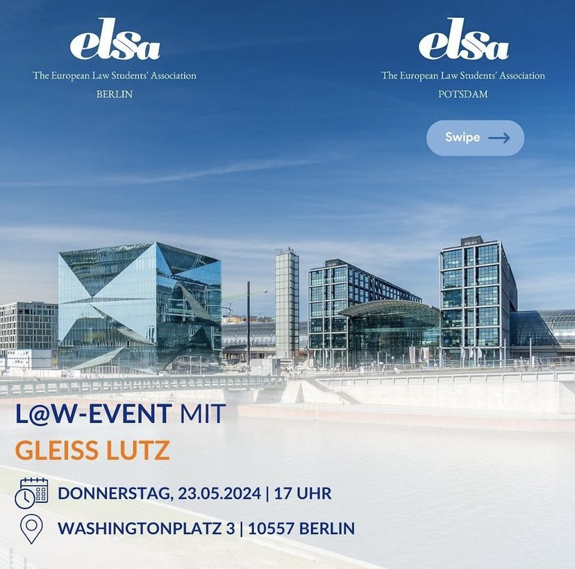 wir, ELSA Potsdam & ELSA Berlin, freuen uns Euch mitteilen zu können, dass es ein L@w-Event mit Gleiss Lutz geben wird. Dort erwartet uns ein spannendes Programm, welches exklusiv für uns zusammengestellt wurde. Im Anschluss gibt es ein Get-Together um den Abend mit lockereren Gesprächen sowie Food and Drinks ausklingen zu lassen. Nutzt die Gelegenheit, andere Anwältinnen und Anwälte von Gleiss Lutz in entspannter Atmosphäre persönlich kennenzulernen, Erfahrungen auszutauschen und neue Kontakte zu knüpfen.